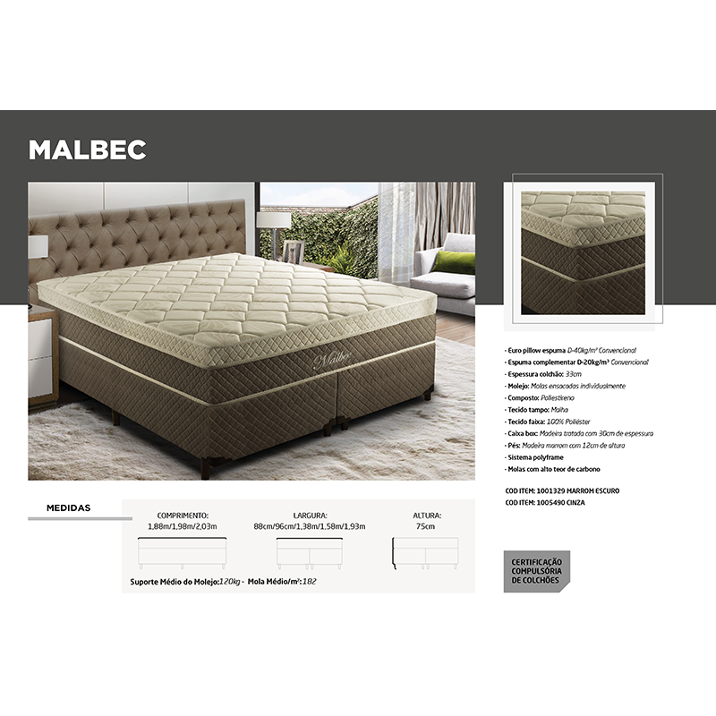 – Euro pillow espuma D-40kg/m3 Convencional | Espuma complementar D-20kg/m3 Convencional | Espessura colchão: 33cm | Molejo: Molas ensacadas individualmente | Composto: Poliestireno | Tecido tampo: Malha | Tecido faixa: 100% Poliéster | Caixa box: Madeira tratada com 30cm de espessura | Pés: Madeira marrom com 12cm de altura | Sistema polyframe | Molas com alto teor de carbono | Suporte Médio do Molejo:120kg – Mola Médio/m2: 182 COD ITEM: 1001329 MARROM ESCURO COD ITEM: 1005490 CINZA