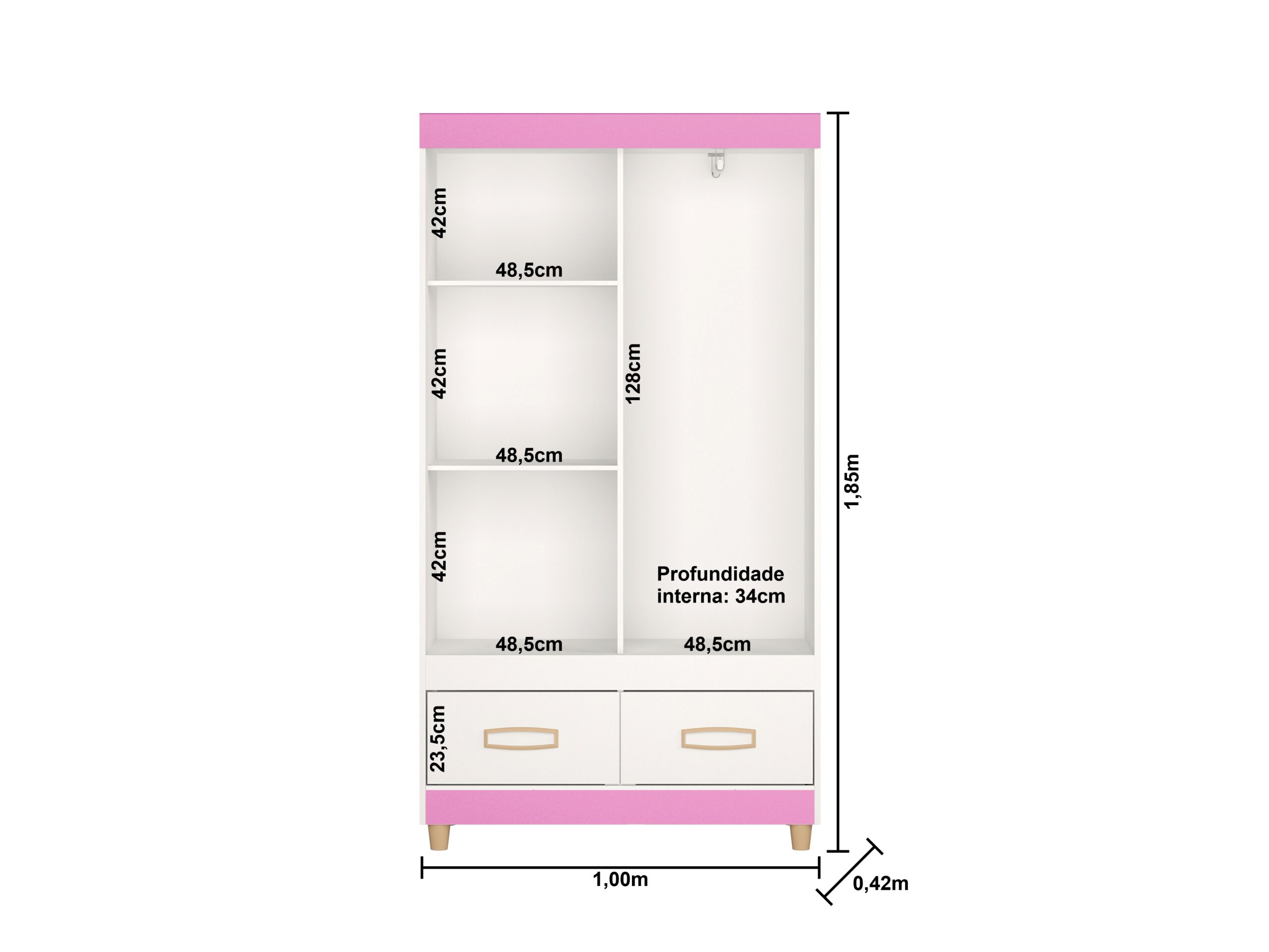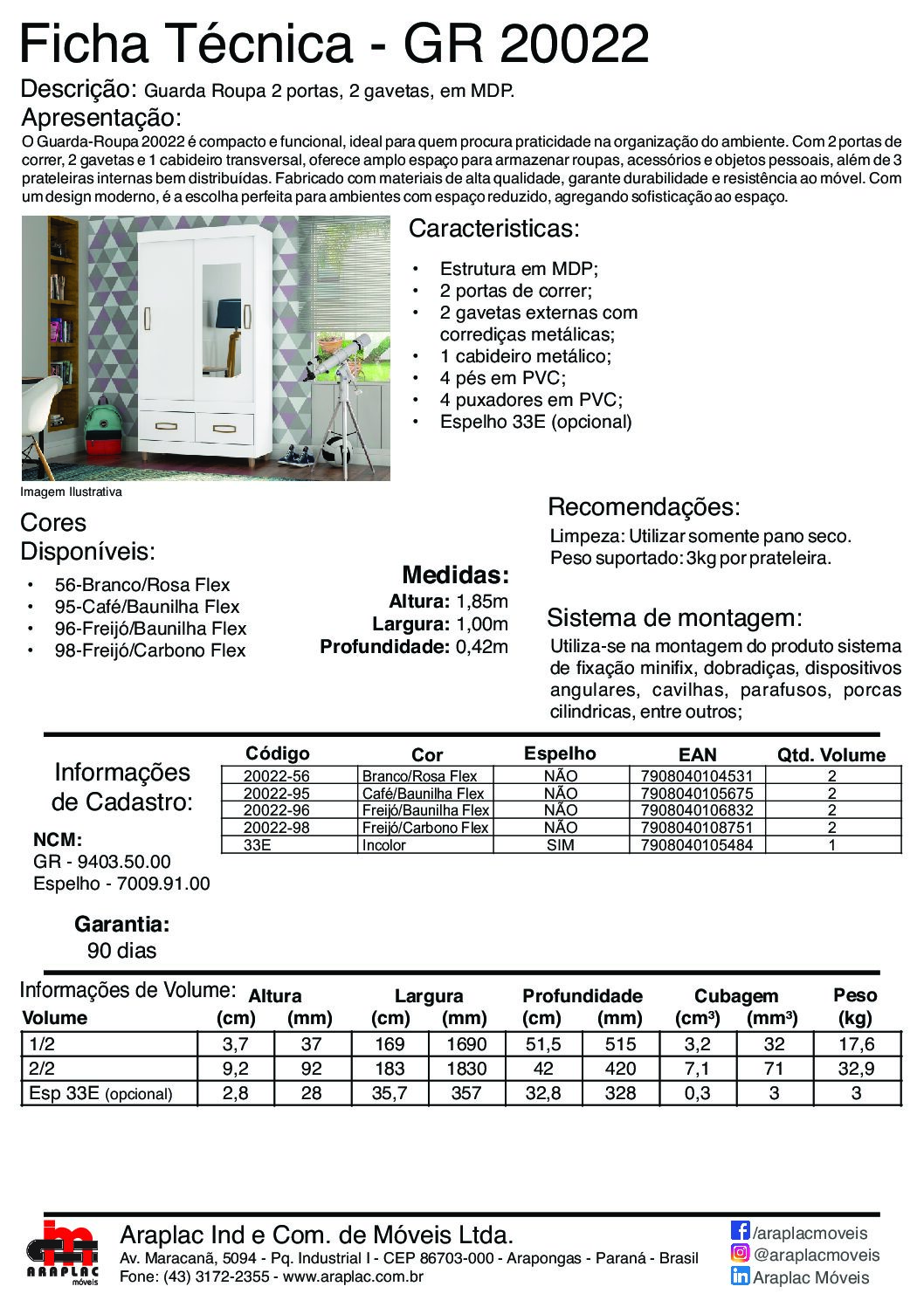Altura: 1,85m Largura: 1,00m Profundidade: 0,42m Volume: 2un Peso: 50,5kg